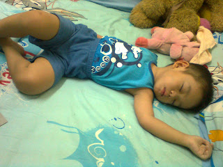 - 34 months old (at present): Mommy decided that it's high time to train him to go diaperless throughout the night. So on the night of 27th March 2011, Juan Or went diaperless. Mommy asked him to go urinate first before sleeping to which he said he had no urine. Mommy remembered checking whether his shorts was wet or not at about 2am, it was not wet, so Mommy went back to sleep. Another check done at 4am and his shorts and the mattress were all wet! Mommy was furious and scolded (and lectured) him repeatedly! Mommy even threatened that should he wet his shorts and mattress again, Mommy would impose the sleep-standing-up punishment on him again. Sure enough, the scolding and threat worked and he didn't wet himself nor the mattress on the nights of 28th and 29th March. He even obliged to go urinate at the toilet bowl when Mommy asked him to. Anyway, on Mommy's part, Mommy also woke him up at approriate intervals to go urinate to which he did, sometimes with fuss, sometimes without fuss. Anyway, Mommy's objective is reached already! Yippy! :-D
