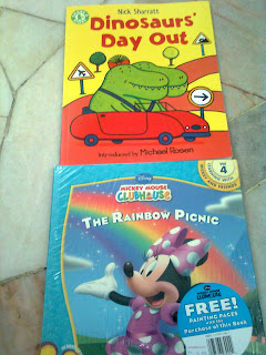 Since Juan Or loves to play with stickers (and loves peeling the stickers out again!), Mommy found these books just right for him, each for RM8 (very worth it!). Mind you, the books are hard-covered, the pages are that of board books and they are storybook-cum-activity-fun books, plus there are 100 (or more) vinyl stickers for Juan Or to stick and peel till his fingers ache!